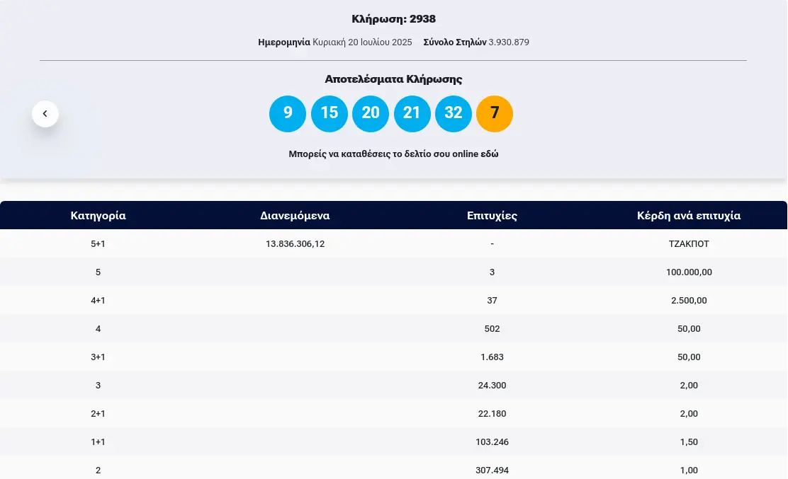 Στην κλήρωση της 20ης Ιουλίου 2025, οι αριθμοί που κληρώθηκαν ήταν οι εξής: 3, 17, 20, 24, 32 και τζόκερ 10. Αυτή η κλήρωση είχε μεγάλη συμμετοχή, με αρκετές επιτυχίες στον πρώτο και δεύτερο βαθμό. Δεκάδες παίκτες κέρδισαν από 5.000 έως 1.000.000 ευρώ, ανάλογα με τον αριθμό των σωστών επιλεγμένων αριθμών.
