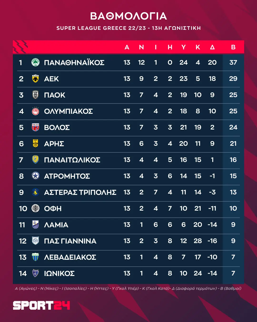 - 1. Παναθηναϊκός – 38 βαθμοί