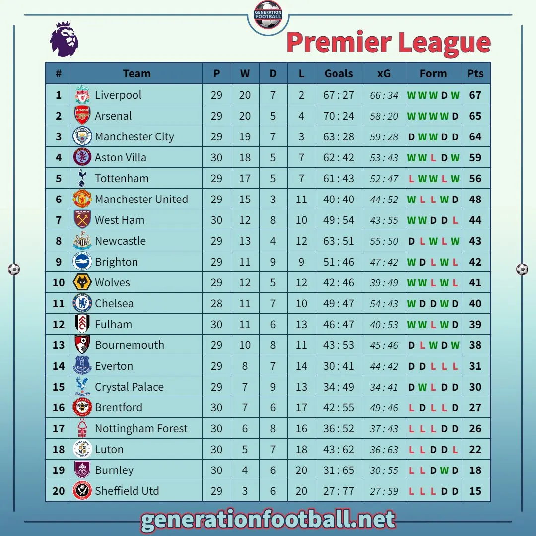 Με τη σεζόν 2023-2024 σε πλήρη εξέλιξη, οι ομάδες βρίσκονται σε έναν σφιχτό αγώνα για την κορυφή. Η Arsenal και η Manchester City συνεχίζουν να ανταγωνίζονται έντονα για την πρώτη θέση, με τους Gunners να αποδεικνύονται ιδιαίτερα ισχυροί εντός έδρας. Η Liverpool και η Tottenham Hotspur ακολουθούν κοντά, προσπαθώντας να εξασφαλίσουν την είσοδό τους στις θέσεις του UEFA Champions League.
